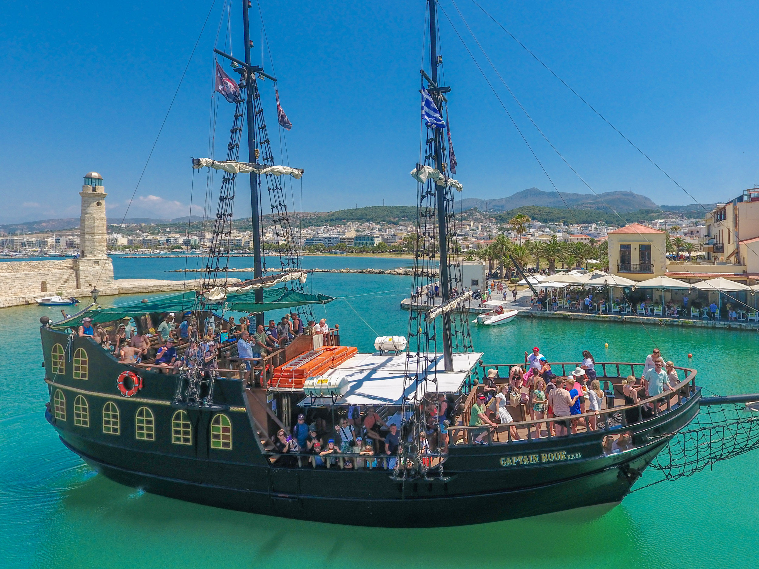 Make a splash in our Pirate Ship , ” Captain Hook ” Cruise for 3 hours to the Eastern Coast of Rethymno with your family and friends.